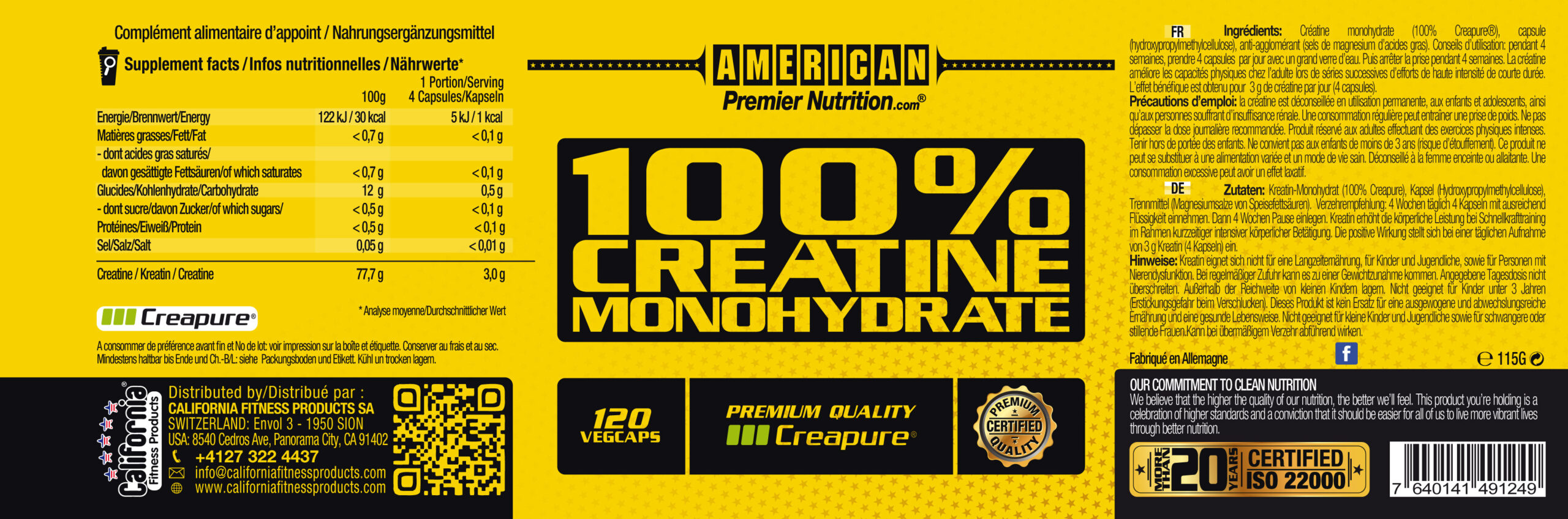 Análisis medio. Suplemento dietético de creatina. Ingredientes: Creatina monohidrato (100% Creapure®), cápsula (hidroxipropilmetilcelulosa), antiaglomerante (sales magnésicas de ácidos grasos). Modo de empleo : Durante 4 semanas, tome 4 cápsulas al día con un gran vaso de agua. A continuación, deje de tomarlo durante 4 semanas. La creatina mejora el rendimiento físico en adultos durante series sucesivas de ejercicio de corta duración y alta intensidad. El efecto beneficioso se obtiene con 3 g de creatina al día (4 cápsulas). Precauciones de uso : La creatina no está recomendada para uso permanente, para niños y adolescentes, ni para personas que sufran insuficiencia renal. Su consumo regular puede provocar un aumento de peso. No supere la dosis diaria recomendada. Este producto está destinado a adultos que realizan ejercicio físico intenso. Mantener fuera del alcance de los niños. Este producto no sustituye una dieta variada y un estilo de vida saludable. No recomendado para mujeres embarazadas o en periodo de lactancia.